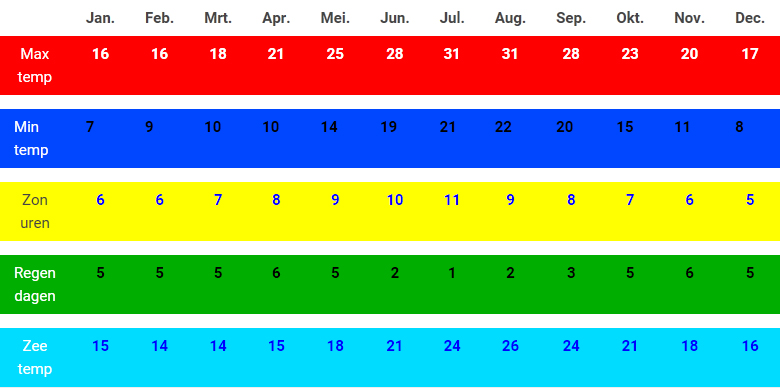 Neerslag valt het hele jaar door vrij weinig en de zon laat zich alle maanden flink zien.